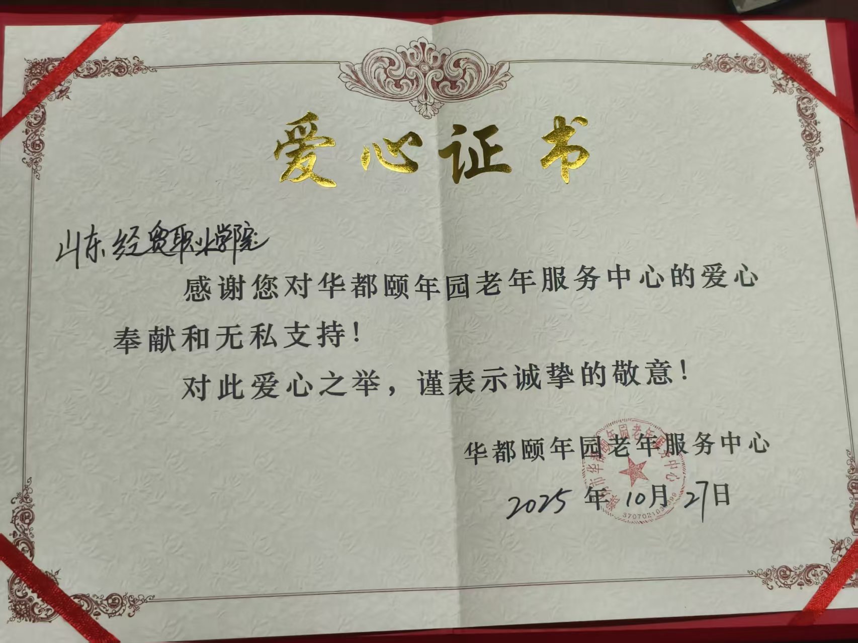 10月27日上午,山东经贸职业学院社会实践基地揭牌仪式在华都颐年园隆重举行。华都颐年园代表,国际商务系“有爱无碍”志愿服务队,信息技术系志愿服务队共同参与。随后,在现场各方的共同见证下,华都颐年园代表与山东经贸职业学院代表一同为“大学生社会实践基地”揭牌,并在现场颁发爱心证书。此次揭牌仪式的成功举办,标志着学校在实践育人道路上又迈出坚实一步。未来,学校将以基地为依托,持续探索更具实效的校企合作模式,为学生成长成才赋能;结合企业产业发展需求与岗位能力标准,推动课程体系与行业实践深度对接,为学生创新更多实践机会,最终实现 “教学 - 实践 - 就业 - 产业” 的良性互动,为区域经济发展培养更多高素质应用型人才。